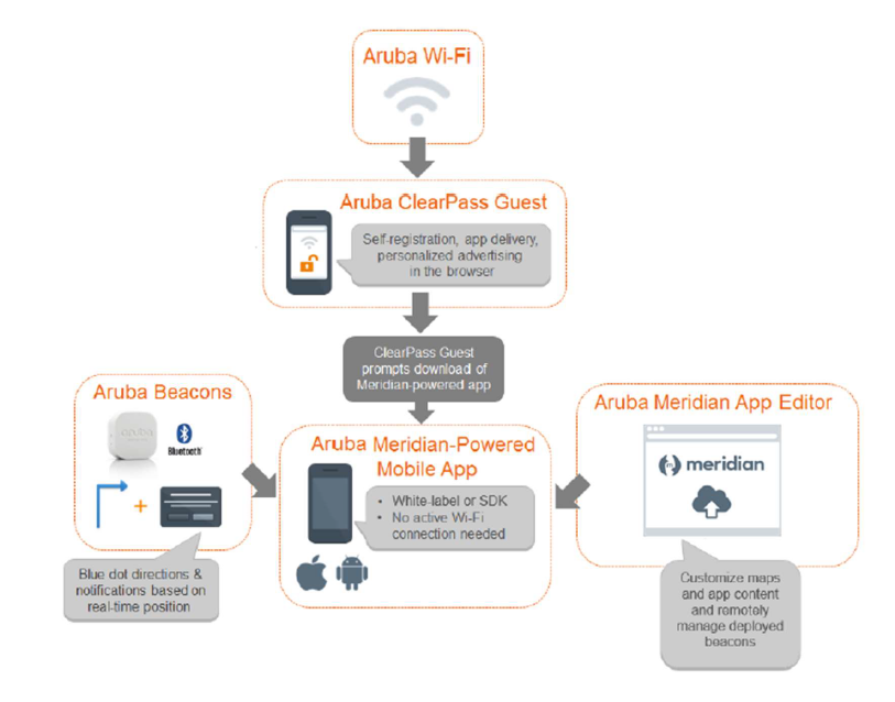 ClearPass i Meridian aplikacija funkcioniraju zajedno kao koordinirana solucija. ClearPass omogućava gostima da se spoje na bežičnu mrežu te skinu Meridian aplikaciju na svoj mobilni uređaj. Aruba beaconi postavljeni na lokaciji šalju signale putem bluetootha mobilnom uređaju i temeljem jačine signala lociraju korisnika na samoj mapi koja je vidljiva korisniku.