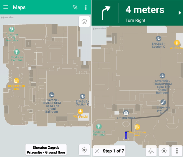 Meridian aplikacija omogućava posjetiteljima da dođu do željene lokacije pomoću jednostavne, interne navigacije.